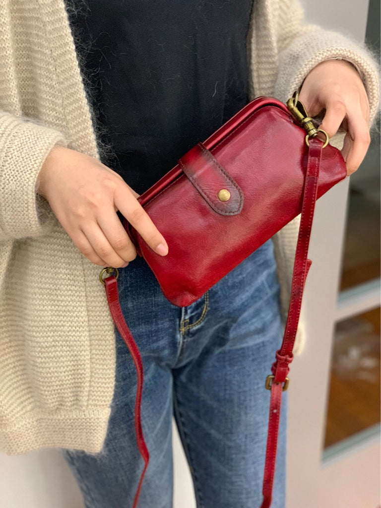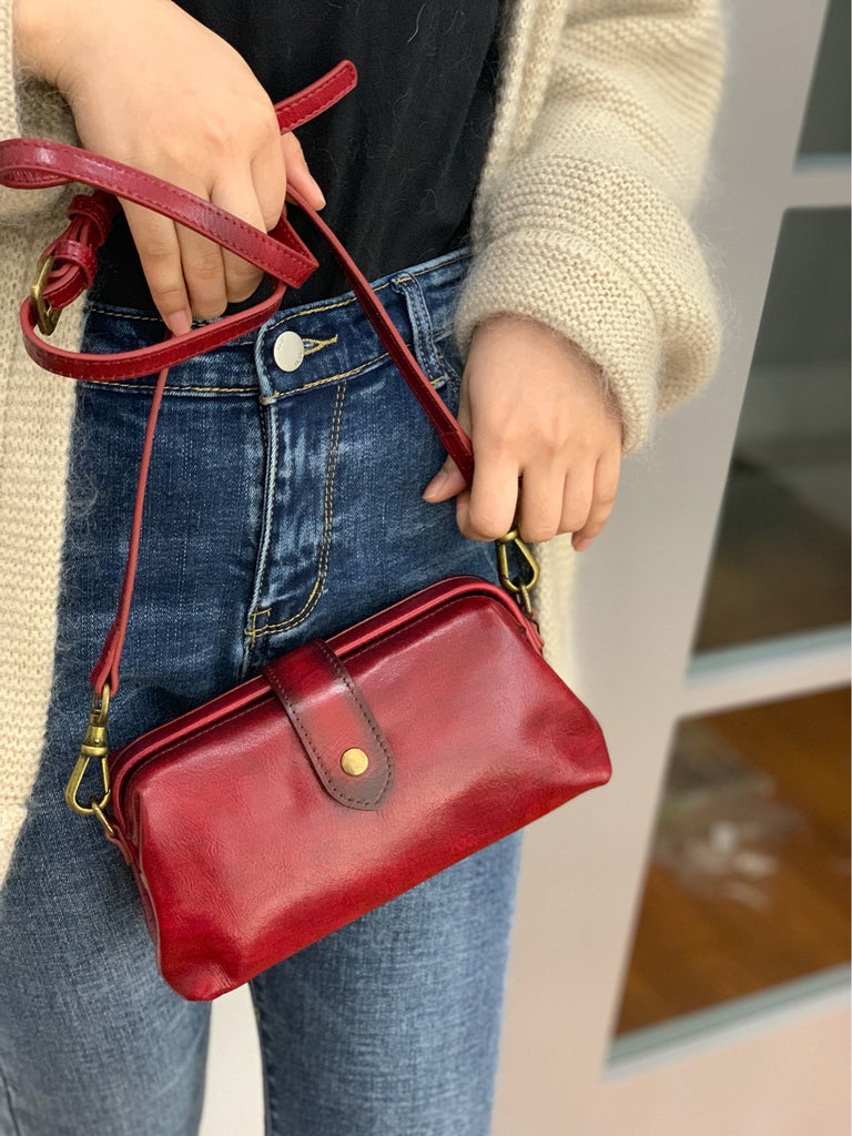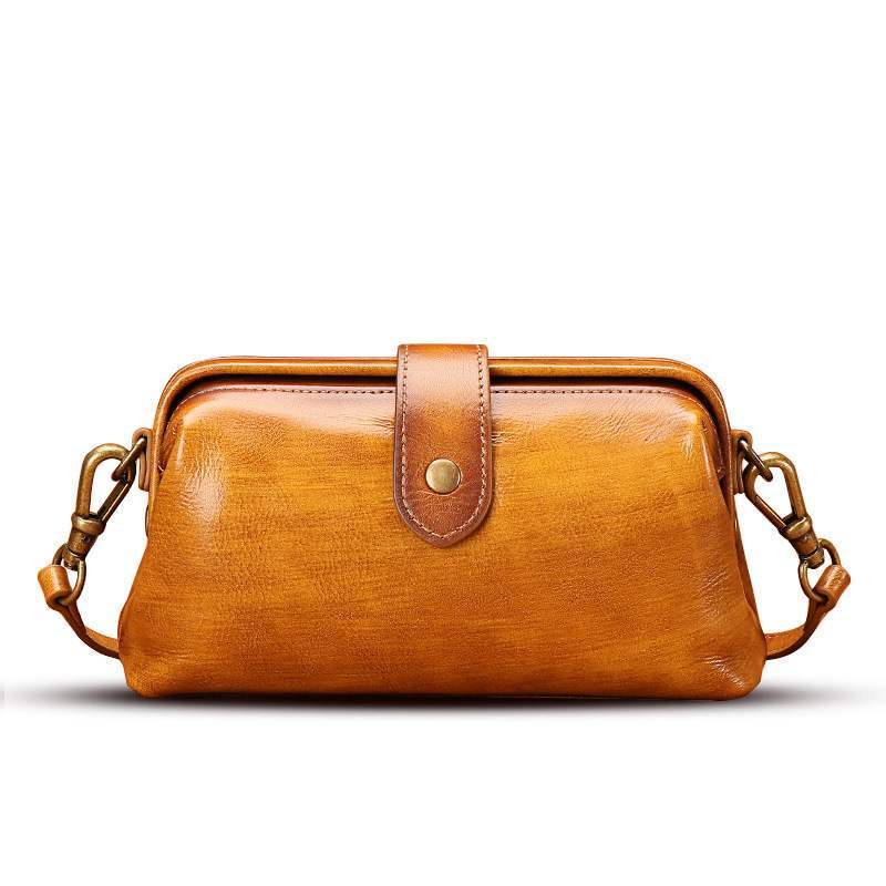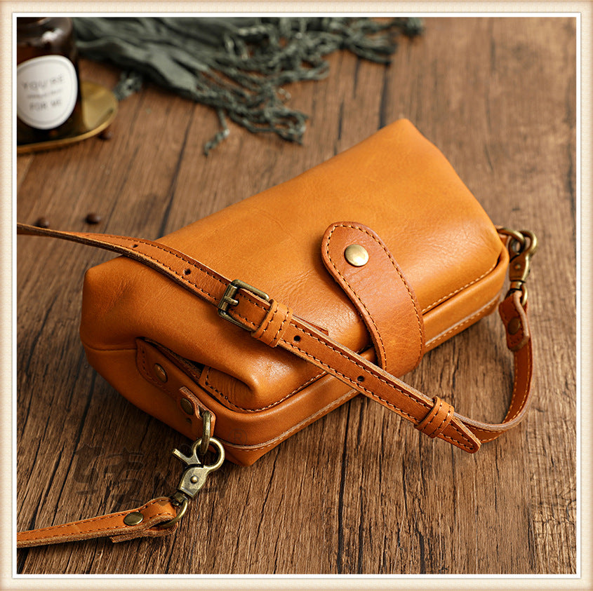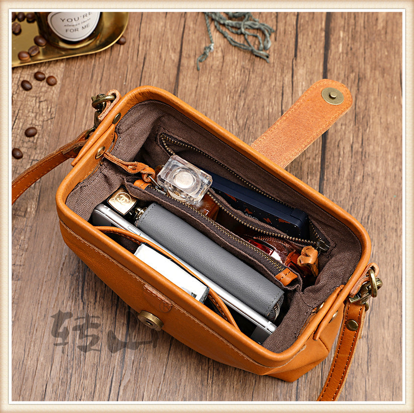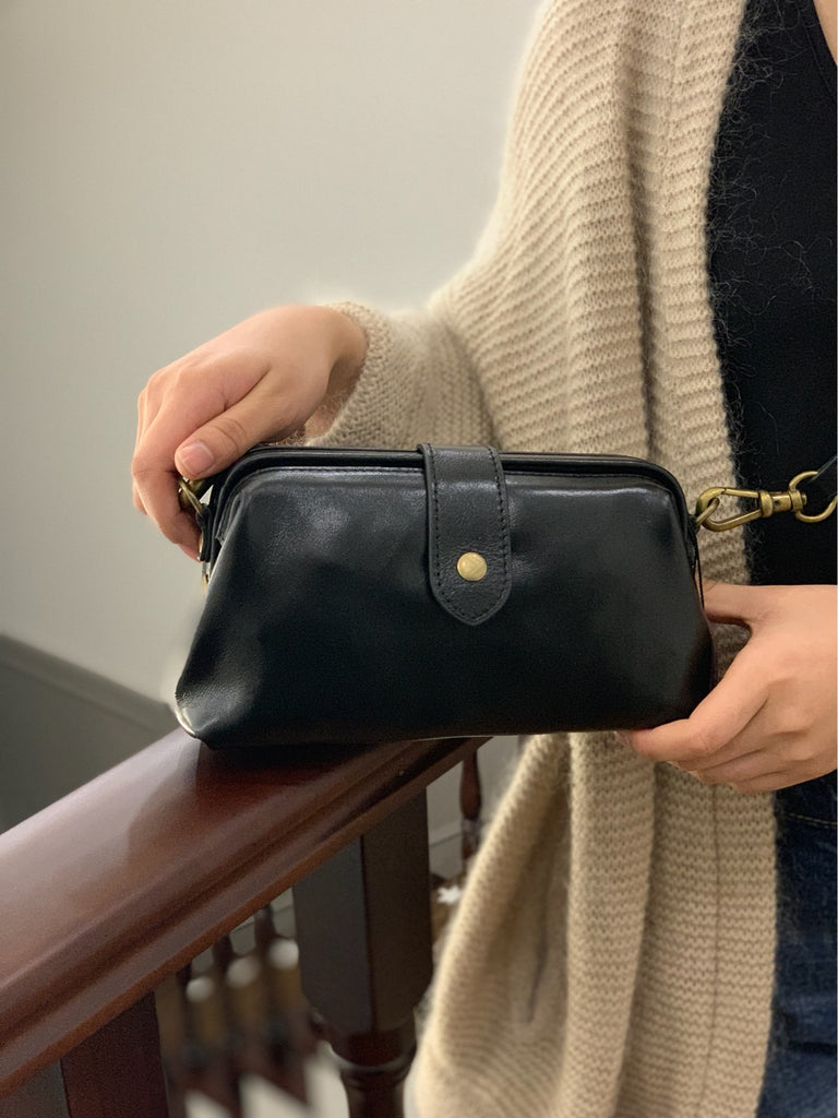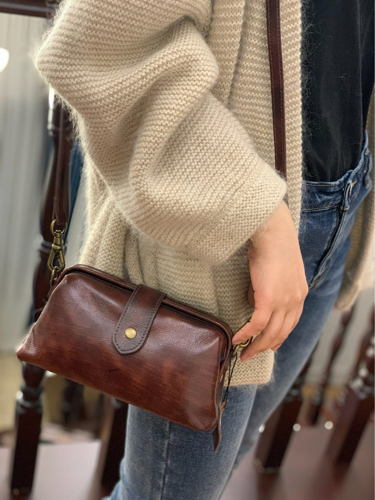 Our small or mini leather doctor bag is a really spacious yet small bag. It has a magnet closing with a buckle on top and a pully to open frame at top. It’s 4.3” tall and 8.7”wide. The adjustable long strap expands to 47”. The lining of this small leather doctor bag is canvas with a built in internal nylon zip pocket. You’d be surprised how easy it is to find things in this little gem!
