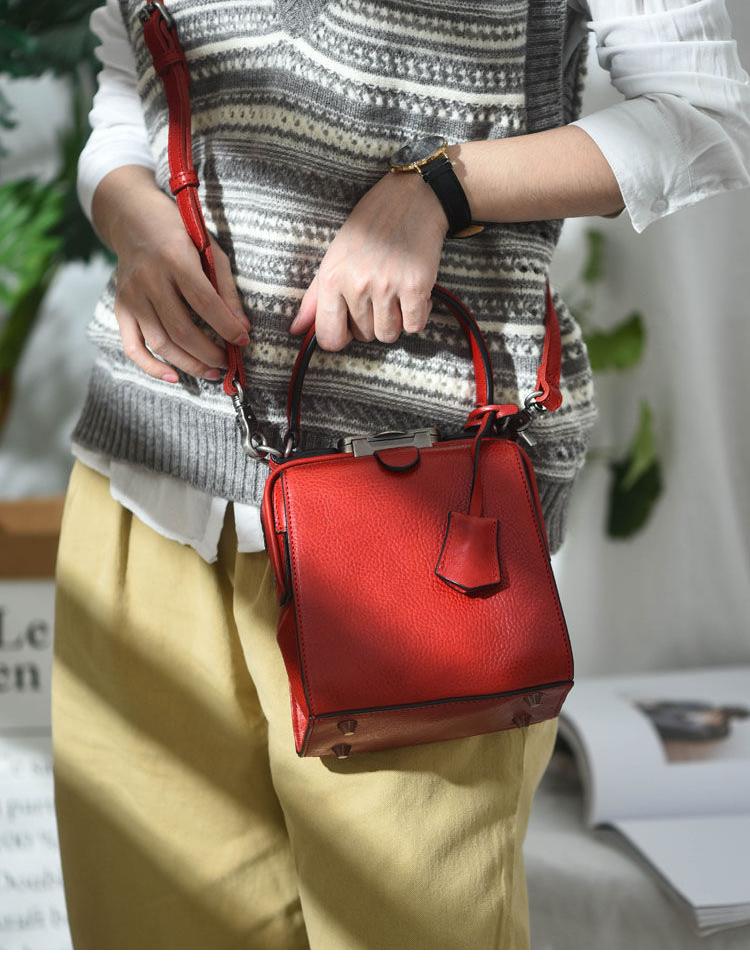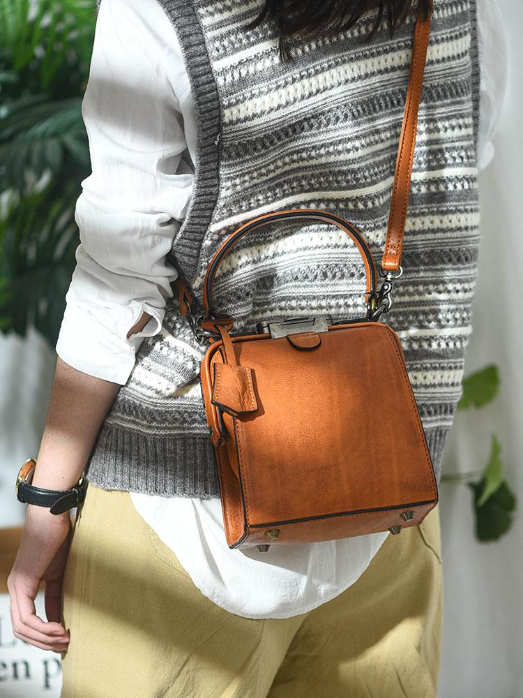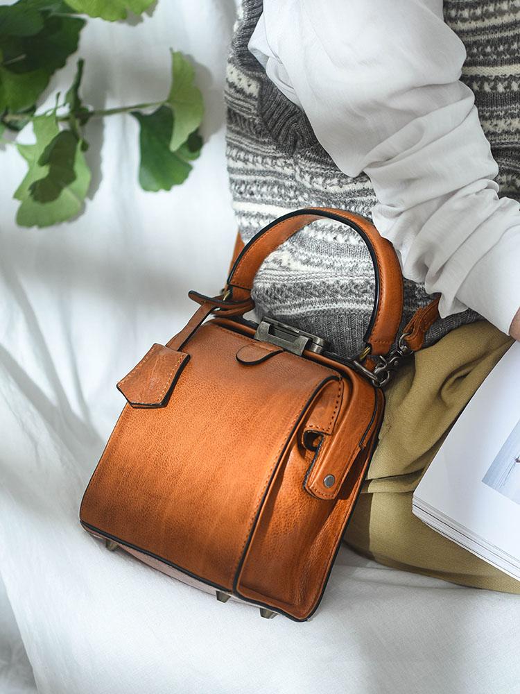Womens Brown Leather Doctor Handbag Purses Square Doctor Crossbody Purse for Women